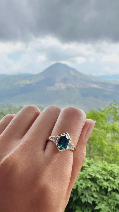 - A 2.31 carat duchess-cut (elongated hexagon) teal sapphire takes center stage, accented by twelve baguette natural diamonds. Set in solid 18K yellow gold, this design combines striking geometry of art-deco style with refined elegance.